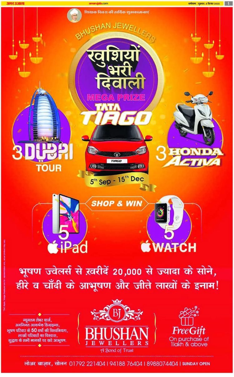 मशहूर भूषण ज्वैलर्स ने इस बार भी दिवाली खुशियां भरी बना दी है। ग्राहकों के लिए 20 हजार की खरीद पर भी लाजवाब ईनाम रखे हैं। मैगा ईनाम में तीन एक्टिवा स्कूटी व टियागो कार, दुबई टुअर समेत कई आकर्षक इनाम दिए जाएंगे