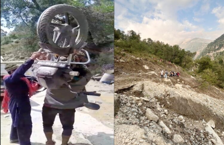 बता दें कि चुराह के चम्बा-नकरोड़-चांजू मार्ग पर डोडनी के पास सड़क धंस रही है। हालांकि लोक निर्माण विभाग ने यहां मार्ग बहाली के लिए मशीनरी तैनात की हुई है, लेकिन बार-बार मार्ग धंसता जा रहा है, जिस कारण यहां दलदल बन रहा है। ऐसे में यहां वाहन चलाना तो दूर, पैदल चलना भी मुश्किल हो रहा है। वहीं शुक्रवार को भी मार्ग पर भारी दलदल हो गया। इस कारण यहां वाहनों की आवाजाही बंद हो गई। वहीं दर्जनों छोटे-बड़े वाहन चालक सड़क मार्ग खुलने के इंतजार में बैठे हुए थे, लेकिन मार्ग खुलने में देरी होने से एक व्यक्ति के सब्र का बांध टूट गया। जरूरी काम होने के कारण युवक ने बाइक को उठाकर दूसरी तरफ जाने की सोची।