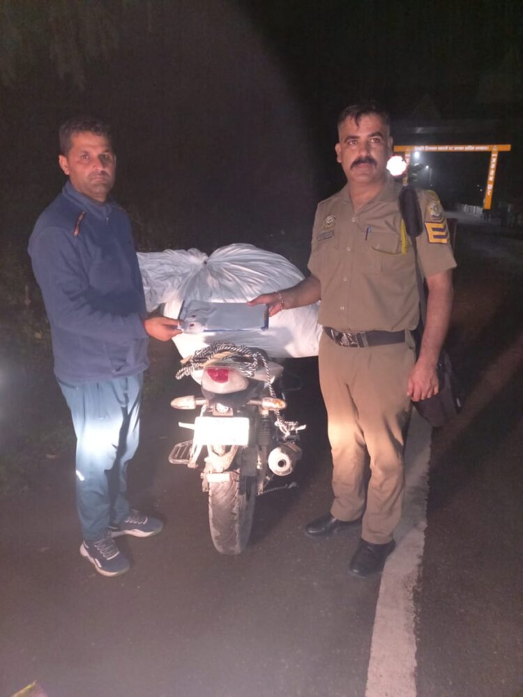सूचना विश्वसनीय थी जिस पर टीम एक दम सतर्क हो गई जो समय 9.30 बजे मोटरसाईकल नम्बर न० HR02AV9043 अपाचे कुलाहल की तरफ से पांवटा की तरफ आती हुई दिखाई दी, जिसके पीछे सफेद रंग का कट्टा रस्सी से बन्या हुआ था। जिसने पुल के किनारे के पास पंहुंचते ही पुल के किनारे पर पुलिस टीम को देखा तो उसने अपने मोटरसाईकल को निचे गिरा दिया तथा मोटरसाईकल चालक यप