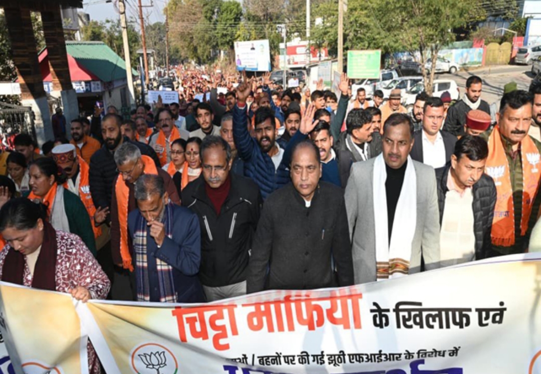 बिलासपुर के लघट गांव में चिट्टा नशे की रोकथाम के लिए पहरा देने में लगी महिलाओं पर दर्ज हुई एफ.आई.आर. से गुस्साई भाजपा ने मंगलवार को बिलासपुर के मेन मार्कीट में धरना प्रदर्शन किया व रोष रैली निकाली। धरना प्रदर्शन व रैली में पूर्व मुख्यमंत्री व नेता प्रतिपक्ष जयराम ठाकुर विशेष रूप से शामिल हुए। उन्हें भाजपा ने तलवार भेंट कर सम्मानित किया। एफआईआर का दंश झेल रही लघट गांव की चिट्टा योद्धा महिलाओं पिंकी शर्मा, कंचन कुमारी व सुमन को भी मंच से हिमाचली टोपी, शाल व तलवार भेंट कर सम्मानित किया गया। इन चिट्टा योद्धा महिलाओं ने इस तलवार को म्यान से निकाल कर हवा में लहरा कर चिट्टे के खिलाफ की इस लड़ाई में हार न मानने के इरादों का जोरदार इजहार किया।