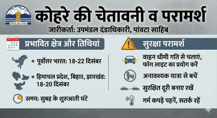 पांवटा साहिब: भारत मौसम विज्ञान विभाग (IMD) से प्राप्त जानकारी के अनुसार आगामी दिनों में प्रातःकाल एवं सुबह के समय घने कोहरे (Dense Fog) की स्थिति उत्पन्न होने की प्रबल संभावना है। विशेष रूप से—