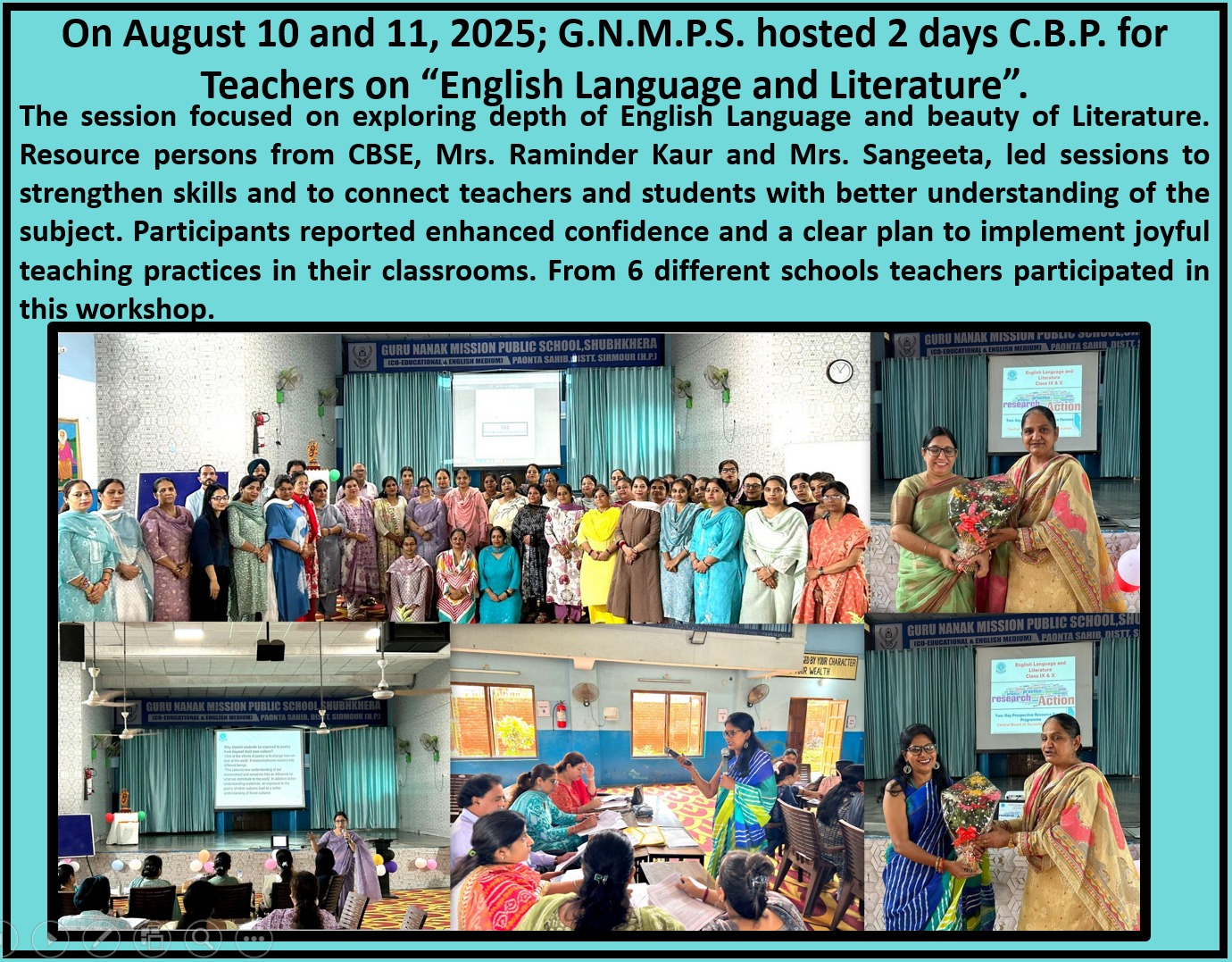 पांवटा साहिब, हिमाचल प्रदेश: गुरु नानक मिशन पब्लिक स्कूल (G.N.M.P.S.) ने 10 और 11 अगस्त 2025 को शिक्षकों के लिए ‘अंग्रेजी भाषा और साहित्य’ पर दो दिवसीय क्षमता निर्माण कार्यक्रम (Capacity Building Program)का सफल आयोजन किया। इस कार्यशाला का मुख्य उद्देश्य शिक्षकों को अंग्रेजी भाषा और साहित्य की गहराई और सुंदरता को समझाने में मदद करना था।