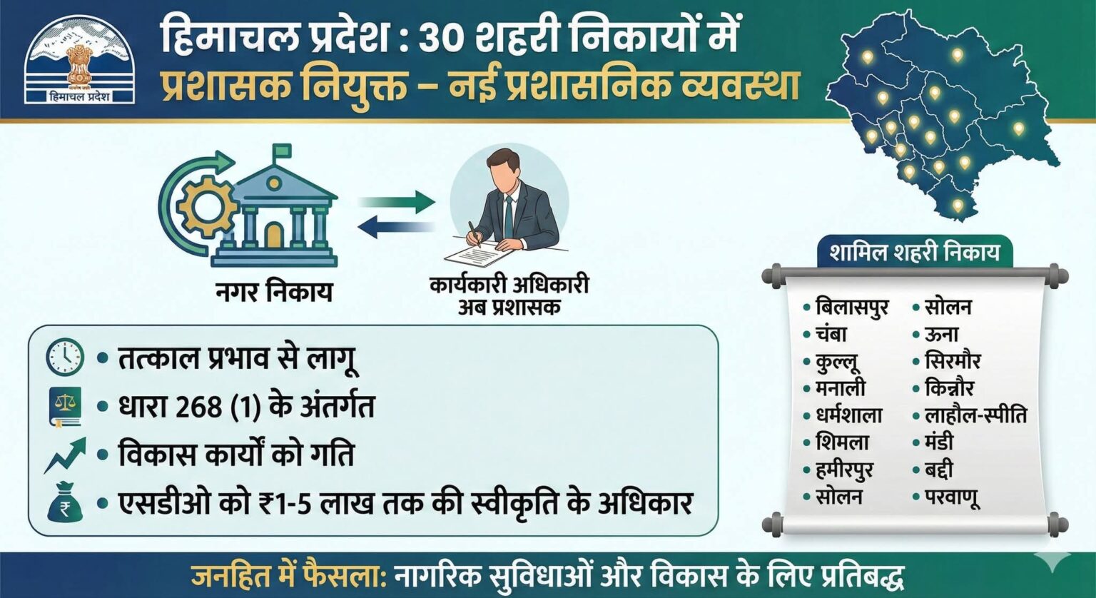 हिमाचल प्रदेश में 30 शहरी निकायों में प्रशासक नियुक्त, नगर प्रशासन को मिली नई व्यवस्था