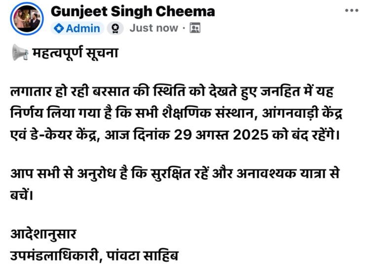 पांवटा साहिब के सभी स्कूल कालेजों में एक दिन की छुट्टी घोषित कर दी गई है।  एसडीएम गुंजीत सिंह चीमा ने जानकारी देते हुए बताया की 29 अगस्त को सभी आंगनबाड़ी केंद्र, स्कूल और कॉलेज बंद रहेंगे। उन्होंने बताया कि इस सभी को को निर्देश दे दिए गए हैं। मौसम के लगातार खराब रुख और भारी बारिश को देखते हुए  ये फैसला प्रशासन ने लिया है