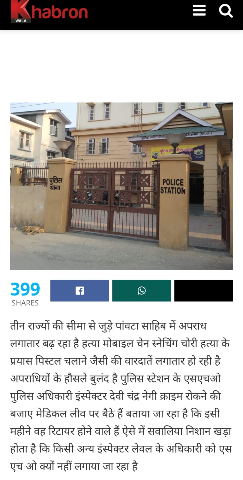 खबरोंवाला की खबर का असर हुआ है इसके बाद सिरमोर के पुलिस अधीक्षक के आदेशों के अनुसार पावटा साहिब पुलिस स्टेशन में नए एसएचओ इंस्पेक्टर कुलवंत सिंह ने ज्वाइन कर लिया है आज ही उन्होंने थाने का प्रभार संभाला है वही इंस्पेक्टर देवी चंद नेगी जो की मेडिकल लीव पर बैठे थे और इसी महीने रिटायर होने वाला है को पुलिस लाइन में ट्रांसफर दिया गया है इसके साथ ही एक नए सब इंस्पेक्टर और दो ए एस आईं ने भी ज्वाइन किया है