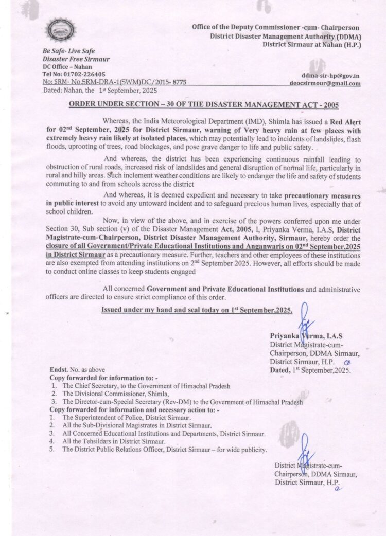 अब, उपरोक्त के मद्देनजर, और आपदा प्रबंधन अधिनियम, 2005 की धारा 30, उप धारा (v) के तहत मुझे प्रदत्त शक्तियों का प्रयोग करते हुए, मैं, प्रियंका वर्मा, आईएएस, जिला मजिस्ट्रेट-सह-अध्यक्ष, जिला आपदा प्रबंधन प्राधिकरण, सिरमौर, एहतियात के तौर पर जिला सिरमौर में 2 सितंबर, 2025 को सभी सरकारी/निजी शैक्षणिक संस्थानों और आंगनवाड़ी को बंद करने का आदेश देती हूं।