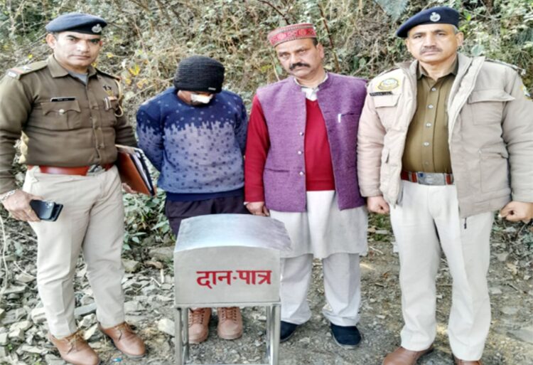 थाना पूर्व की टीम ने त्वरित कार्रवाई करते हुए सीसीटीवी फुटेज से आरोपी की पहचान की और उसे गिरफ्तार कर लिया। आरोपी की निशानदेही पर चोरी किया गया दानपात्र कुसुम्पटी वन क्षेत्र के निकट कुम्हाली गांव के पास झाड़ियों से बरामद कर लिया गया। वहीं आरोपी के पास से नकदी भी बरामद हुई है। आराेपी की पहचान जय प्रकाश (31) पुत्र जलम सिंह निवासी गांव फागू, तहसील शिलाई व जिला सिरमौर के रूप में की गई है। पुलिस ने आरोपी के खिलाफ बीएनएस की धारा 303(2) के तहत मामला दर्ज कर उसे न्यायालय में पेश करने की प्रक्रिया शुरू कर दी है।