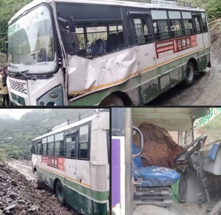जिला सिरमौर के राजगढ़ मंडल के सनौरा नेरीपुल छैला सड़क मार्ग पर रविवार शाम को एक और हादसा हो गया। हिमाचल पथ परिवहन निगम सोलन डिपो की बस नंबर HP63-9865 पर नेरीपुल के समीप बगैरना में पहाड़ी से एक बड़ा पत्थर सीधा बस के अंदर जा पहुंचा। पहाड़ी से बस पर गिरे पत्थर से एक नंबर सीट पर बैठा एक दस साल का बालक घायल हो गया। जबकि सीट नंबर दो पर बैठी एक महिला तथा चालक को हल्की छोटे लगी है। इस हादसे में बस में सवार अन्य 30 यात्री सुरक्षित बच गए। प्राप्त जानकारी के अनुसार यह बस शिमला जिला के चौपाल उप मंडल के बिजमल से सनौरा नेरीपुल होते हुए सोलन की तरफ आ रही थी। नेरीपुल के समीप बगैरना में पहुंचते ही अचानक एक बड़ा पत्थर पहाड़ी से गिरता हुआ बस की एक नंबर सीट पर खिड़की तोड़ते हुए अंदर पहुंच गया। यह घटना जिला सिरमौर के राजगढ़ उपमंडल की अंतिम पंचायत कुंडू लवाना के बगैरना में हुई। सनौरा नेरीपुल छैला सड़क मार्ग पर पिछले दो महीनों से सेब सीजन के चलते कई सड़क हादसे हो चुके हैं। मगर फिर भी प्रशासन इन हादसों से कोई सबक नहीं ले रहा है। 15 अगस्त को इस सड़क की खस्ता हालत को लेकर एक प्रतिनिधिमंडल लोक निर्माण मंत्री विक्रमादित्य सिंह से नाहन में भी मिला था। उधर जब इस संदर्भ में डीएसपी राजगढ़ विद्या चंद नेगी से संपर्क किया गया। तो उन्होंने बताया कि बस पर पत्थर गिरने की जानकारी मिली है, मगर अभी तक किसी ने भी पुलिस में शिकायत दर्ज नहीं करवाई है। उधर हिमाचल पथ परिवहन निगम सोलन डिपो के क्षेत्रीय प्रबंधक सुरेंद्र राजपूत ने बताया कि पहाड़ी से अचानक बड़ा पत्थर बस पर गिरने से एक छोटे बच्चे को हल्की चोटे लगे हैं। बस में करीब 30 सवारियां सफर कर रही थी, बाकी सभी सुरक्षित है।