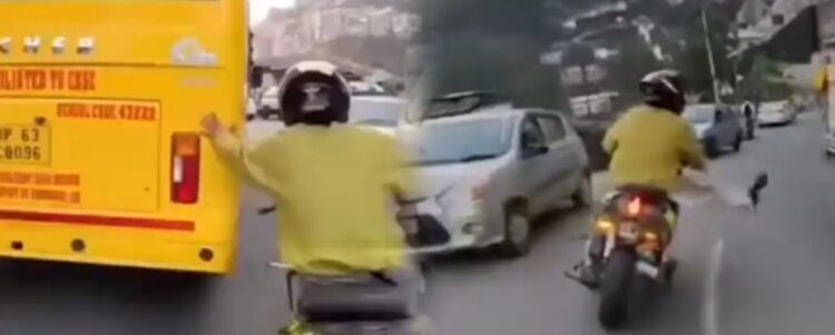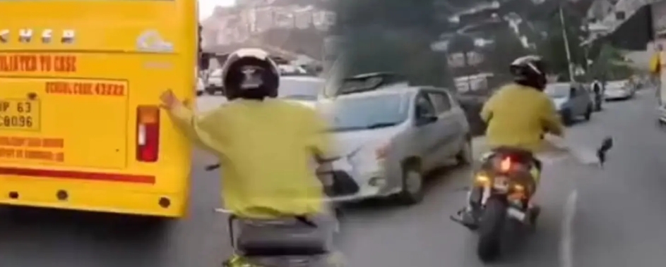 वीडियो में एक दृश्य ऐसा भी है जहां एक बाइक सवार चलती कार को लात मारता हुआ दिखाई देता है। वहीं एक महिला जो अपने बच्चे के साथ स्कूल से घर लौट रही थी, वह बाइक से टकराने से बाल-बाल बचती है। एक अन्य शॉट में बाइक सवार पिछले टायर पर स्कूटी को खड़ा कर स्टंट करता है और चलती बस को हाथ से छूने की कोशिश करता है।