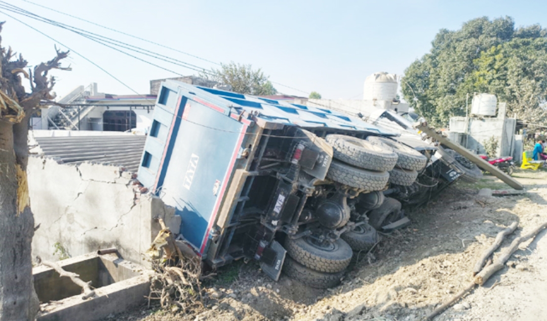 मिलवां-ठाकुरद्वारा सड़क मार्ग पर निर्माण कार्य तेजी से जारी है। इसके बावजूद भारी वाहन चालक तेज रफ्तार में वाहन चलाने से बाज नहीं आ रहे। आए दिन खनन मटीरियल से भरे टिप्पर पलट रहे हैं। स्थानीय लोगों व सरकारी संपत्ति को नुक्सान पहुंचा रहे हैं। बीती रात बसंतपुर में पंजाब की ओर जा रहा खनन मैटीरियल से भरा एक टिप्पर अचानक अनियंत्रित होकर एक घर पर पलट गया। घर के मालिक के अनुसार, रात लगभग साढ़े तीन बजे तेज धमाके की आवाज सुनाई दी। बाहर निकलकर देखा तो खेत में बने मोटर कमरे व शौचालय को तोड़ता हुआ टिप्पर उनके घर की चारदीवारी पर गिरा हुआ था।
