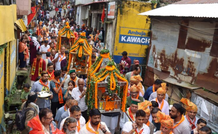 नाहन 04 सितम्बर- उपायुक्त सिरमौर प्रियंका वर्मा ने सिरमौर जिला के सराहां में आज से आरंभ हो रहे तीन दिवसीय राज्य स्तरीय वामन द्वादशी मेला का विधिवत शुभारंभ किया उन्होंने भगवान वामन देव की विधिवत पूजा अर्चना करने के उपरांत वामन देव की पालकी को कंधा देते हुए मंदिर से खंड विकास कार्यालय, नए बस स्टैंड तक शोभा यात्रा निकाली। शोभायात्रा के दौरान पारंपरिक वाद्य दल, राजकीय वरिष्ठ माध्यमिक पाठशाला सराहां के एनसीसी कैडेट , होमगार्ड बैंड, व हजारों की संख्या में स्थानीय लोगों ने भाग लिया। नगर के मध्य में स्थित तालाब में भगवान वामन देव की पालकी को नौका विहार करवाया गया।