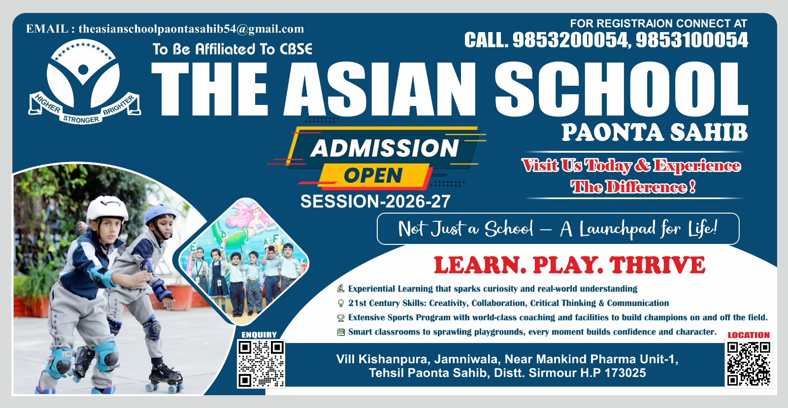 शिक्षा का हब बन चुका पावटा साहिब एक स्कूल की प्रतीक्षा में था परंतु अब यह प्रतीक्षा की घड़ियां पूरी हो चुकी है शहर में विश्व सुविधाओं के साथ बेहतरीन स्कूल “ द एशियन स्कूल “ बनकर तैयार हो चुका है जिसमें एडमिशन भी प्रारंभ हो चुकी है | स्कूल का मुख्य उद्देश्य स्मार्ट वे टू लर्न है जहां को पर बच्चों को स्मार्ट तरीके से पढ़ाई करवाई जाएगी